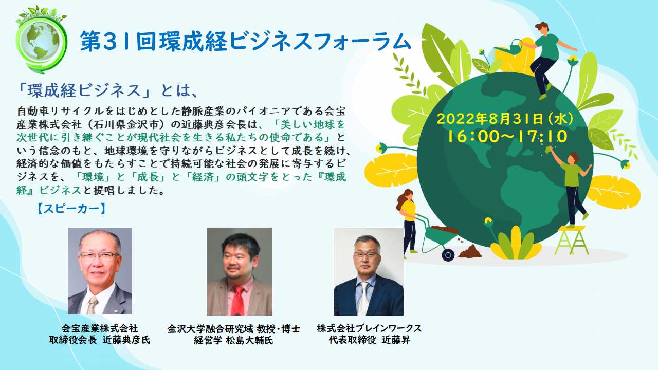 自動車リサイクルをはじめとした静脈産業のパイオニアである会宝産業株式会社(石川県金沢市)の近藤典彦会長は、「美しい地球を次世代に引き継ぐことが現代社会を生きる私たちの使命である」